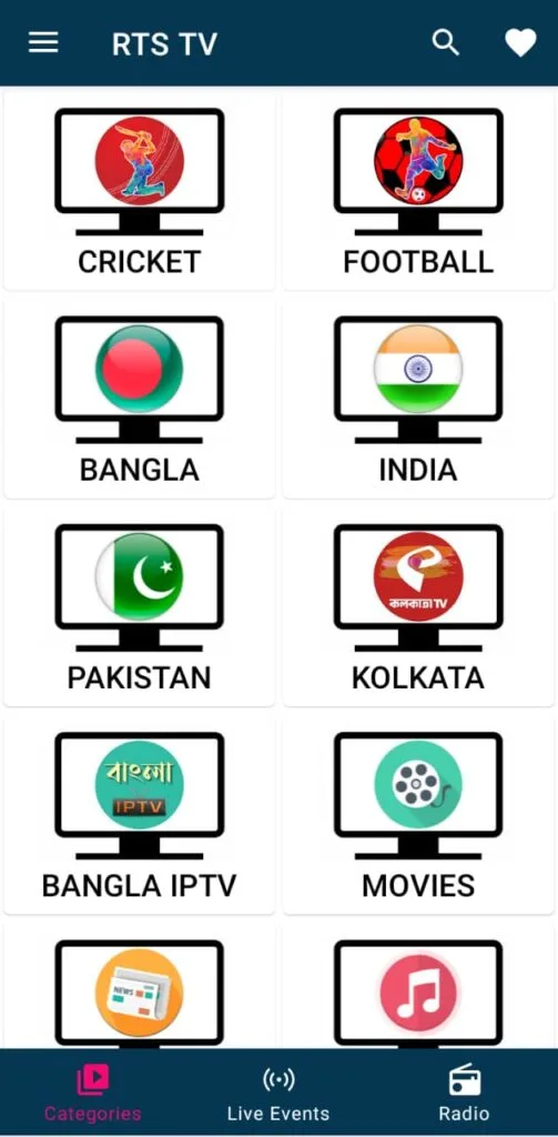 RTS TV bietet verschiedene Kategorien wie Cricket, Fußball, Bangla, Indien, Pakistan, Kolkata, Bangla IPTV, Filme, Nachrichten, Musik, Infotainment und Kinder. Mit dieser Vielfalt gibt es für die ganze Familie etwas Passendes.
