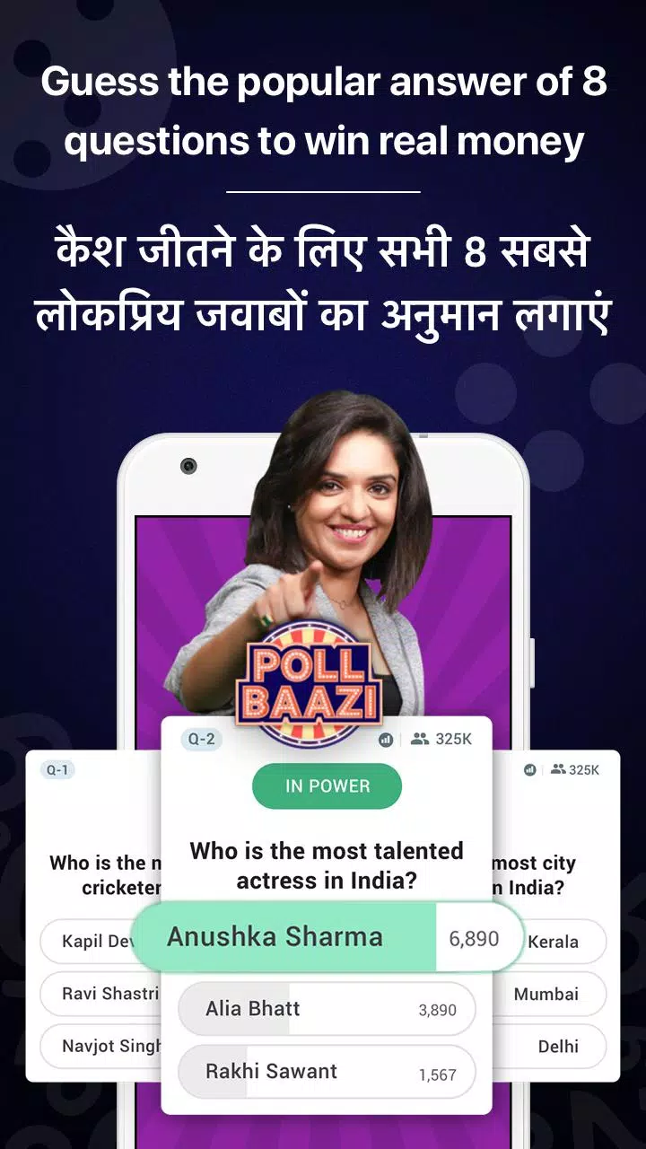 Head to PollBaazi to join live prediction quizzes. The host asks 8 questions, each with 3 options and 10 seconds to answer. No answer is right or wrong—the most popular choice wins. Guess all correctly to share the prize pool. Rejoin after elimination, network issues, or late entry, and use an extra life after a wrong answer.