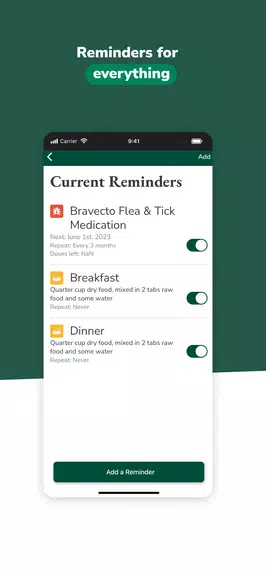 - カスタム投薬アラート:投薬を1回も忘れないように、個人用リマインダーを設定できます。タイムリーな通知で治療計画を順守し、ペットの最適な健康維持を支援します。